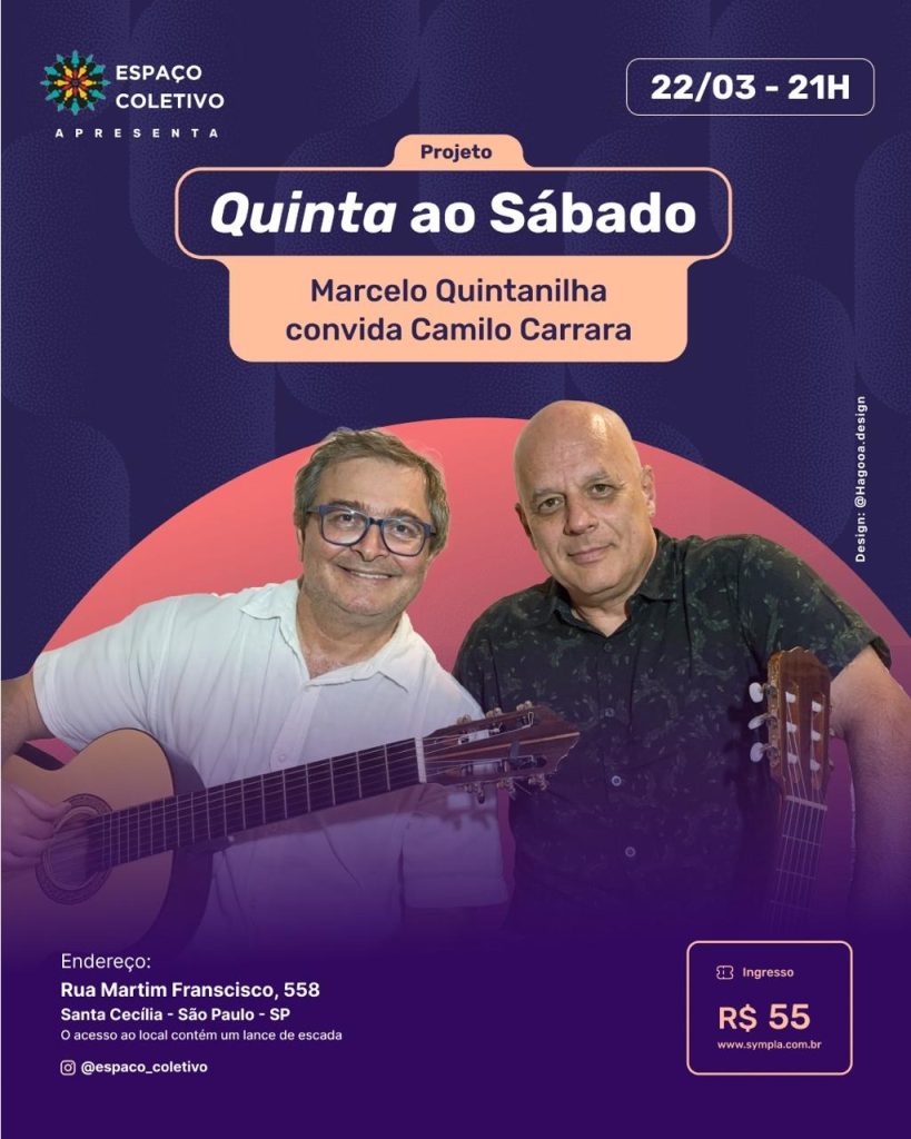 No próximo dia 22/03, Camilo Carrara é o primeiro convidado do projeto ”Quinta aos Sábados”, uma série especial organizada pelo próprio Marcelo.